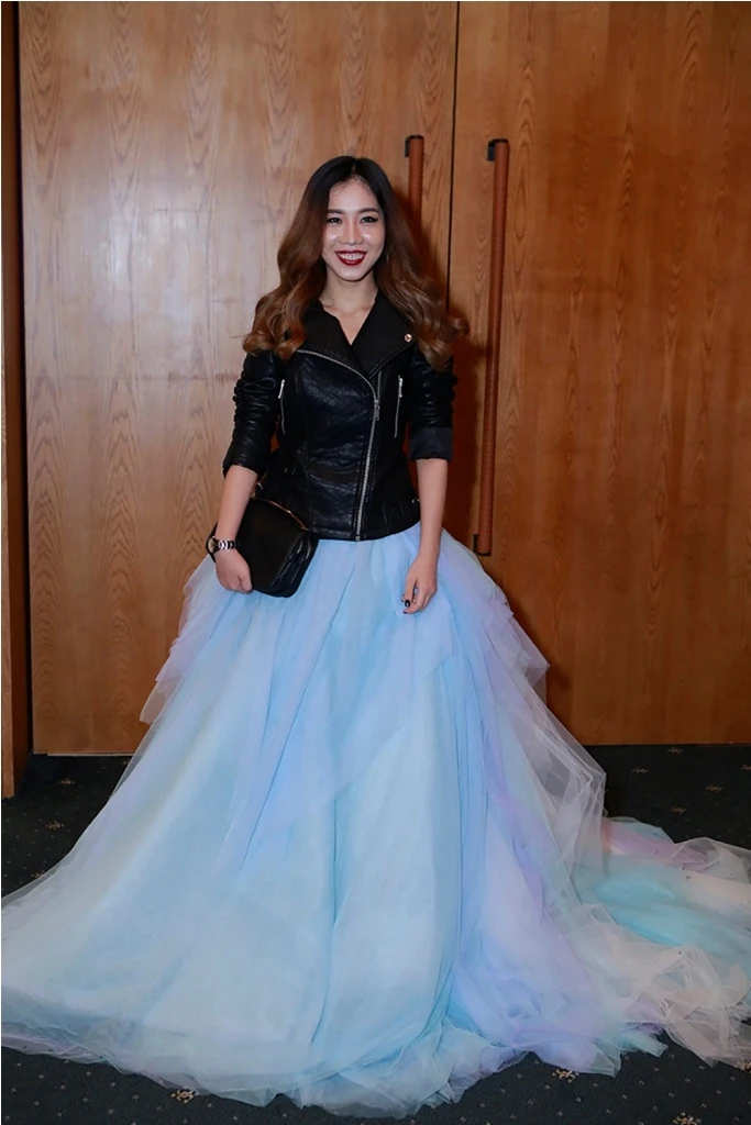 | Một tín đồ khác trong trang phục lạ lẫm, kết hợp phá cách giữa váy dạ hội voan dài cùng áo khoác da hầm hố. |