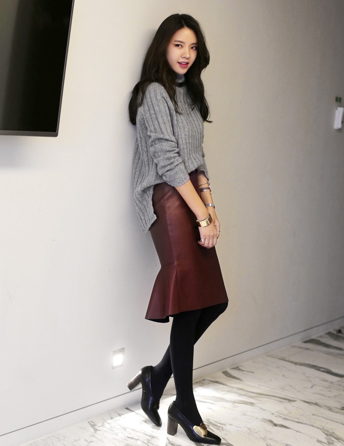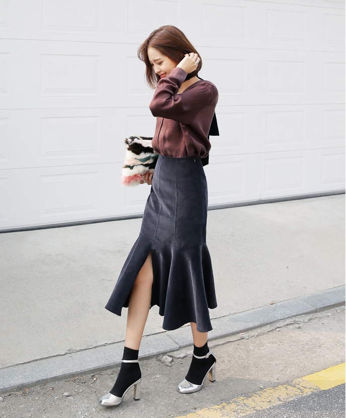 | Váy loe da lộn kết hợp đường xẻ giúp khoe vóc dáng đẹp. |