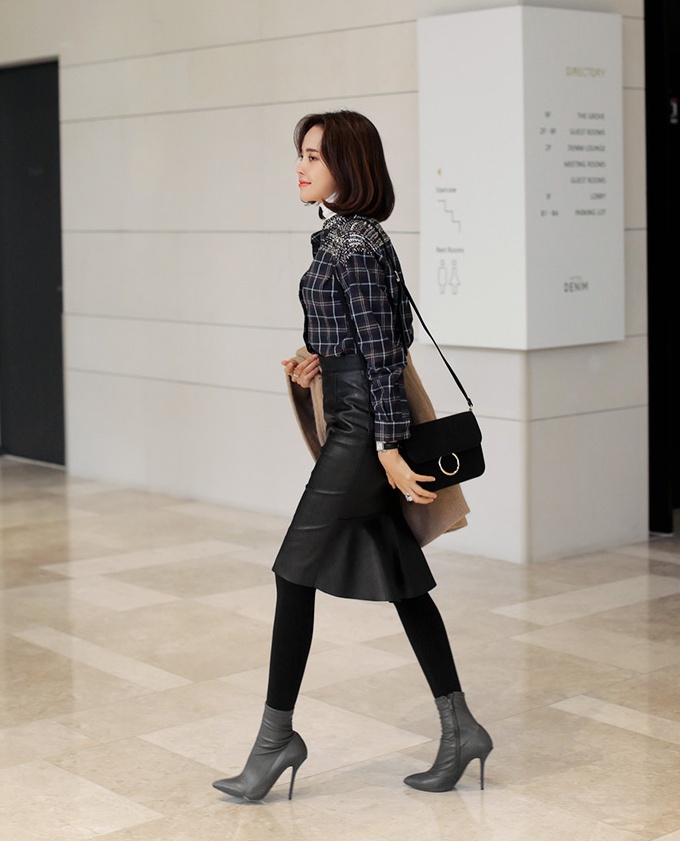 | Các kiểu váy loe chất liệu da cũng được ưa thích bởi vẻ trẻ trung. |