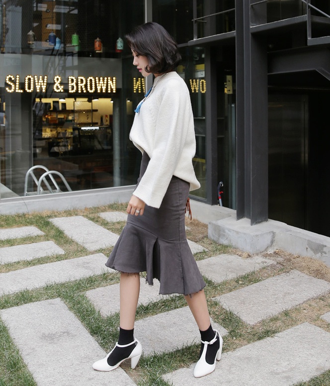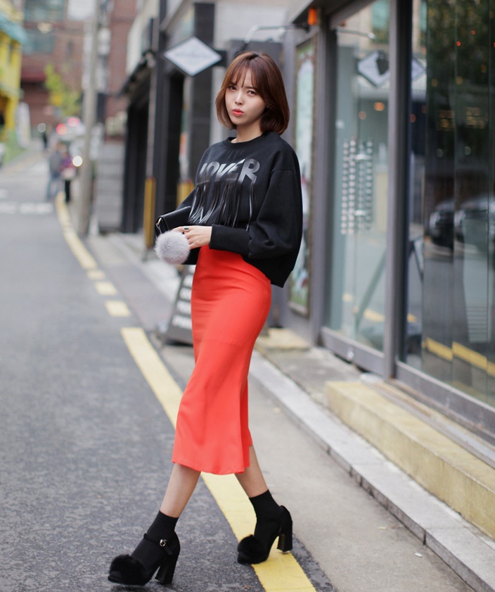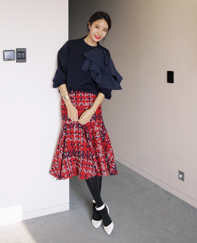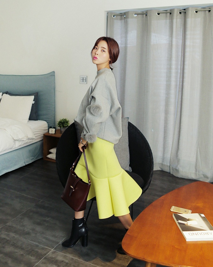 | Cô nàng cá tính với váy loe xé gấu kết hợp áo len oversize. |