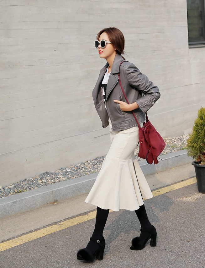 | Váy loe chất liệu da lộn tông trắng trẻ trung được tín đồ thời trang mix kèm áo khoác da năng động. |