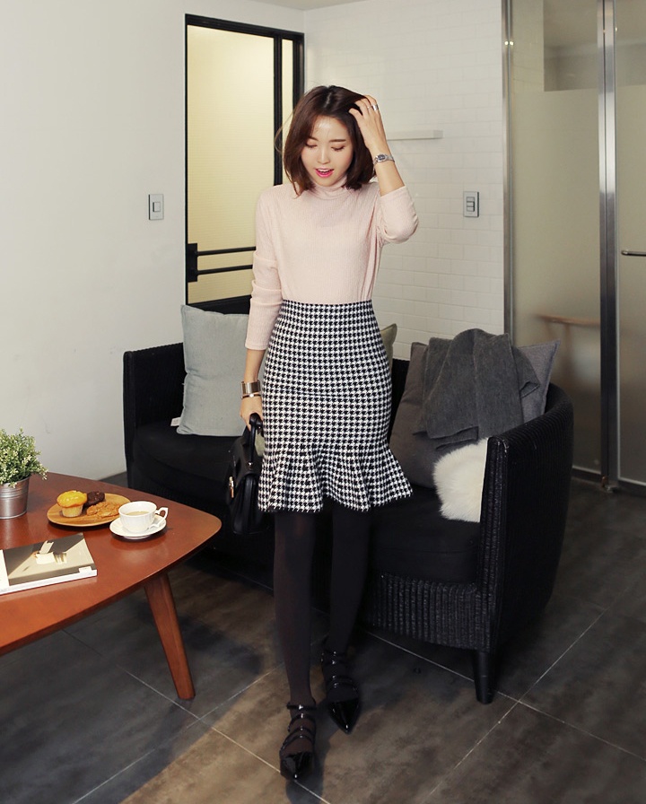 | Với cô nàng công sở thì họa tiết răng ngựa kết hợp váy loe sẽ rất tinh tế. |