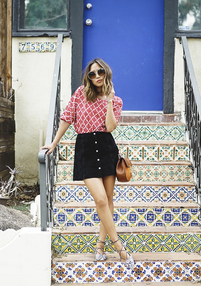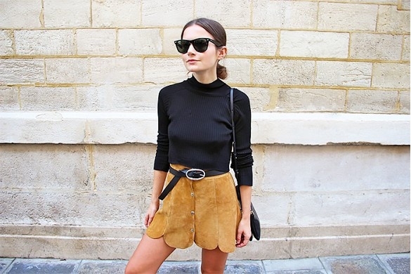 | Váy da lộn đen cũng rất được ưa thích để đi kèm áo họa tiết. |