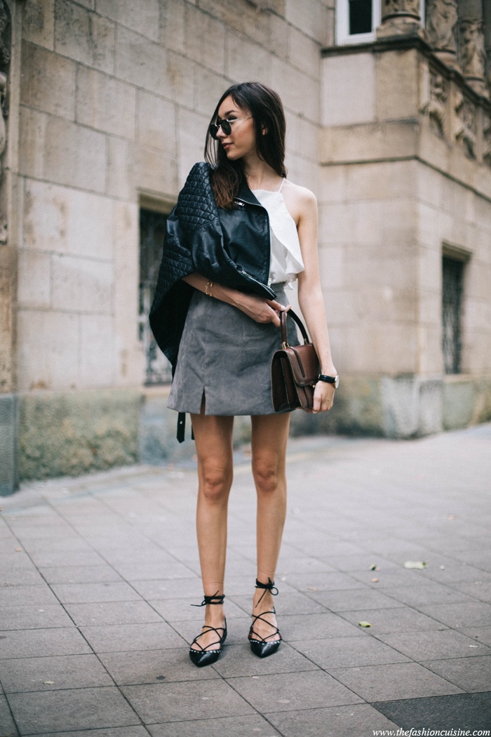 | Váy da lộn với cô nàng công sở có thể dịu dàng hơn nhờ kết hợp áo ren. |