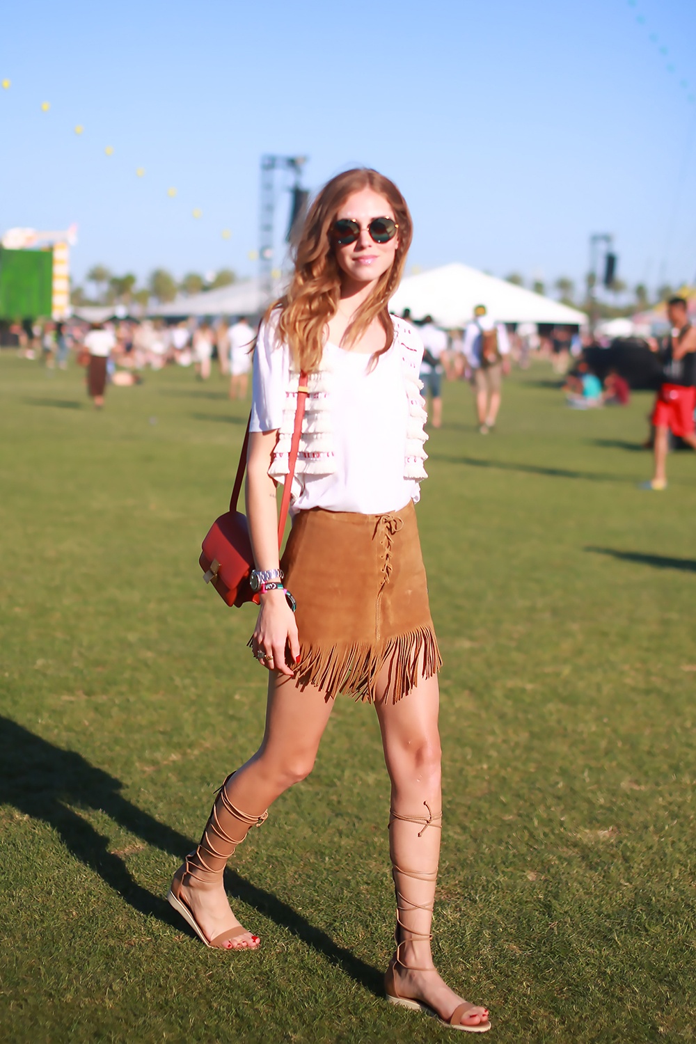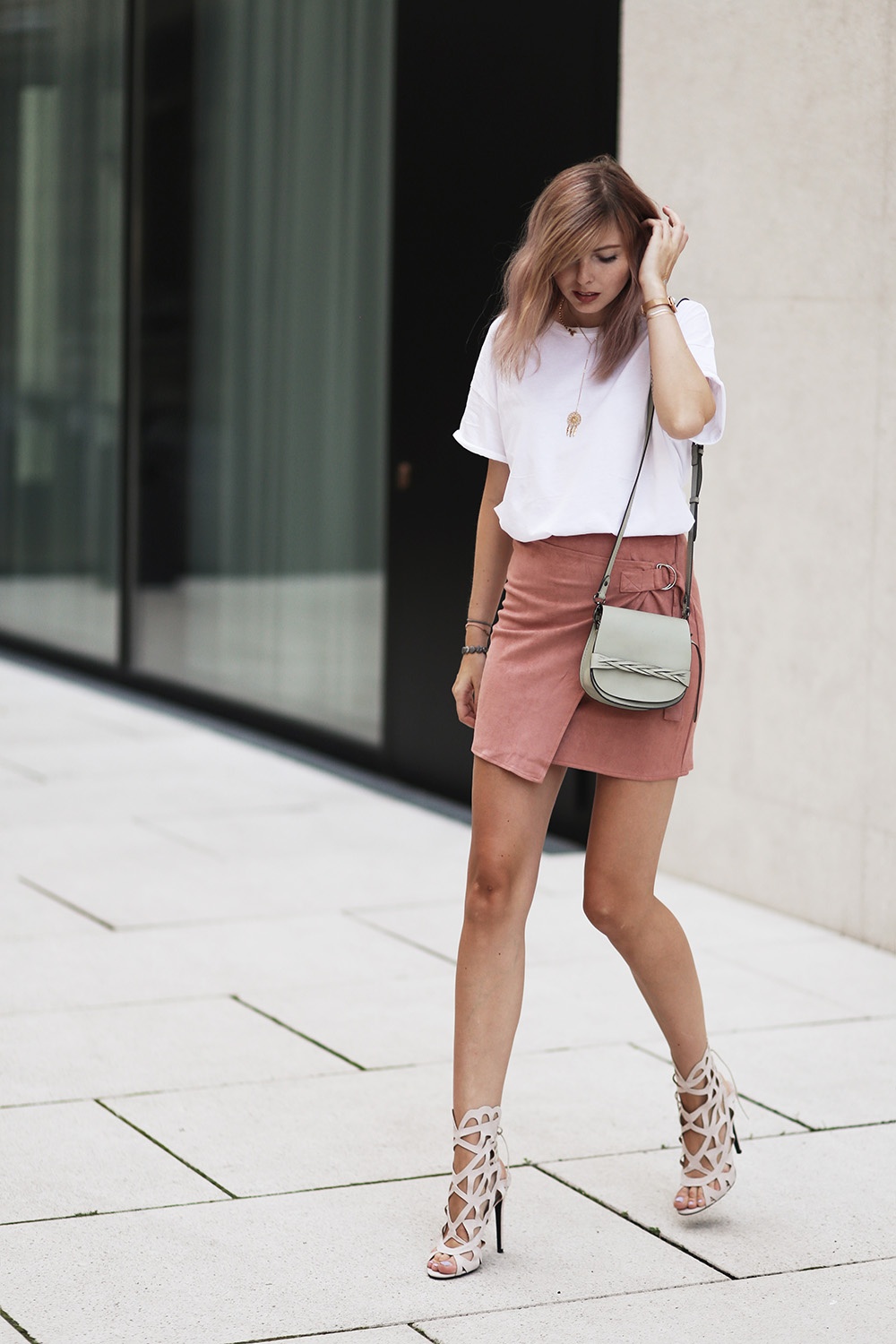 | Cô nàng khoe vẻ cá tính với váy da lộn và áo thun trắng, sandals đấu sĩ. |