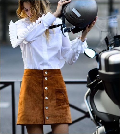 | Với những cô nàng yêu phong cách vintage thì váy da lộn sẽ kết hợp đẹp mắt cùng sơ mi cổ điển. |