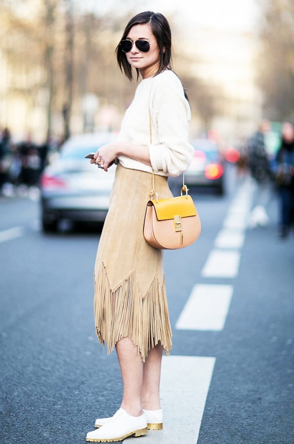 | Váy da lộn tua rua mix với sơ mi cùng chất liệu khẳng định sự tinh tế của người mặc. |