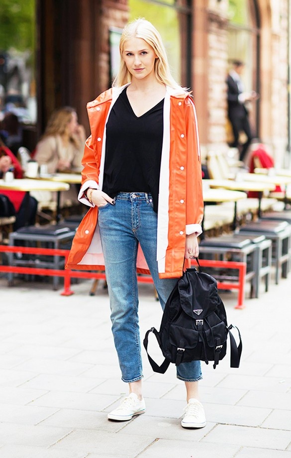 Sneakers trắng kèm quần jeans và áo gió rực rỡ giúp bạn khoe vẻ năng động.