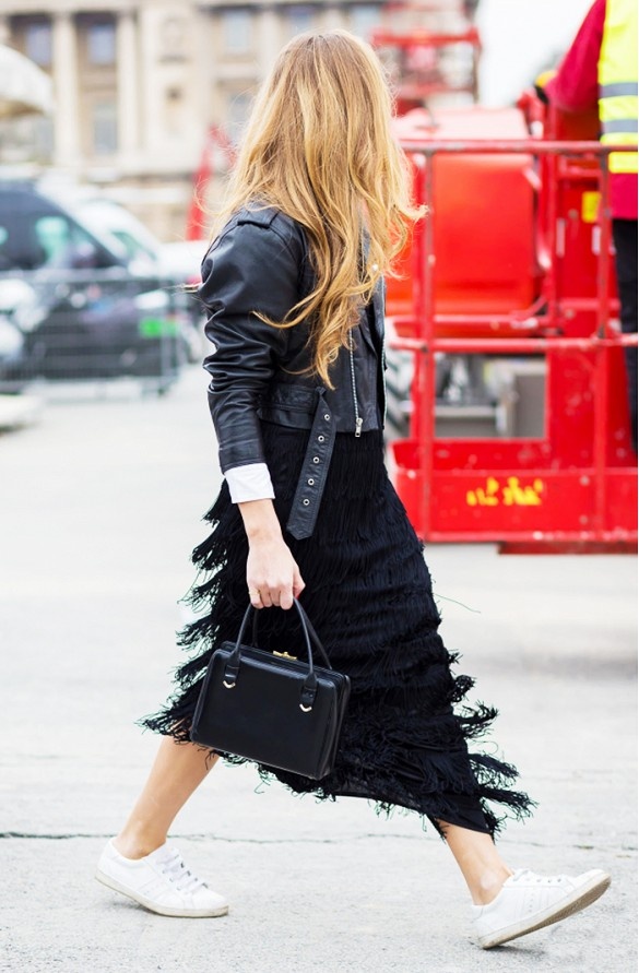 Với những cô gái chân dài thì ý tưởng áo da, váy maxi và giày sneakers sẽ rất tuyệt vời.