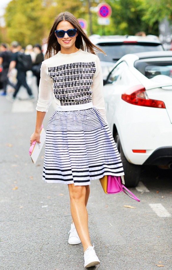 Các cô nàng điệu đà có thể chọn áo len mỏng, váy xòe khi mix kèm giày sneakers.