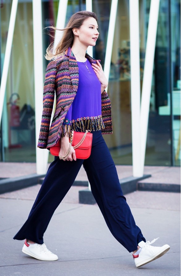 Áo tweed, quần ống rộng và sneakers giúp bạn khoe vẻ cá tính.
