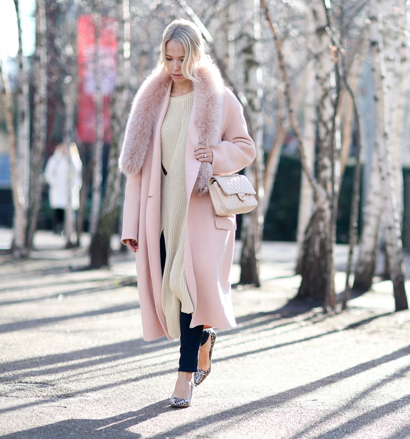 | Áo khoác dạ kết hợp phần cổ lông sang trọng vẻ nữ tính trong tông màu pastel. |