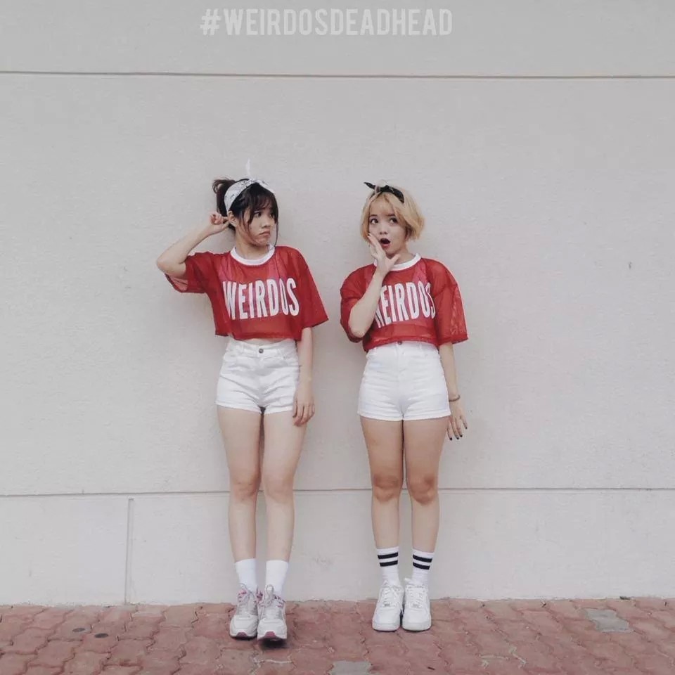 | Hai tín đồ thời trang thể hiện sự sành điệu với thời trang áo xuyên thấu đồng bộ, shorts jeans ngắn và giày thể thao bụi phủi. |