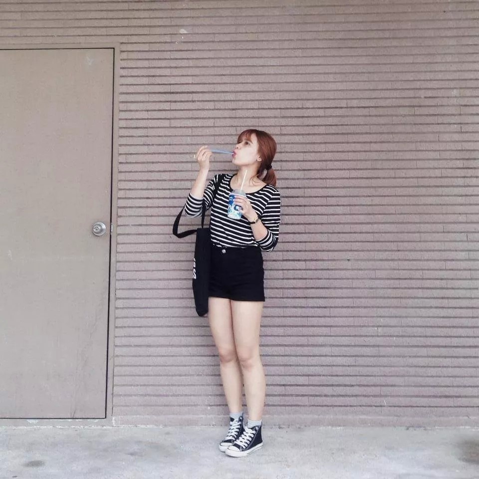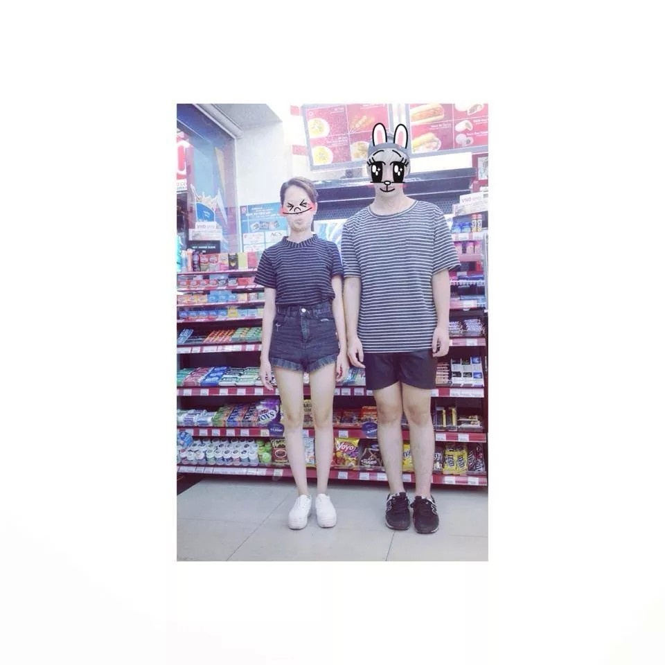 | Set đồ đôi rất dễ thương với áo thun sọc kẻ ngang hợp mốt phối với quần shorts và giày thể thao bụi phủi. |