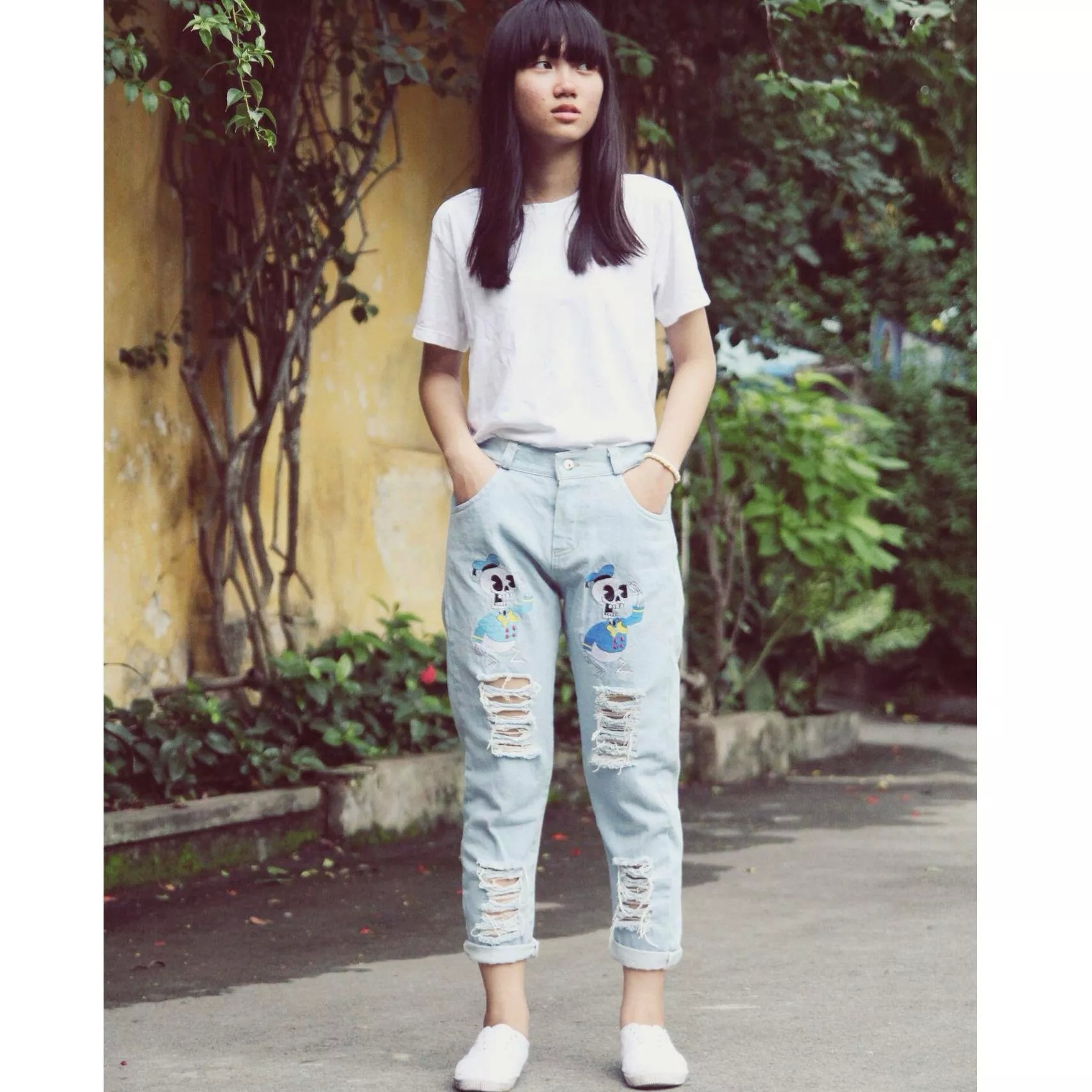 | Tín đồ thời trang này khoe phong cách menwears khi diện quần jeans rách với áo thun trăng, đơn giản nhưng rất cá tính. |