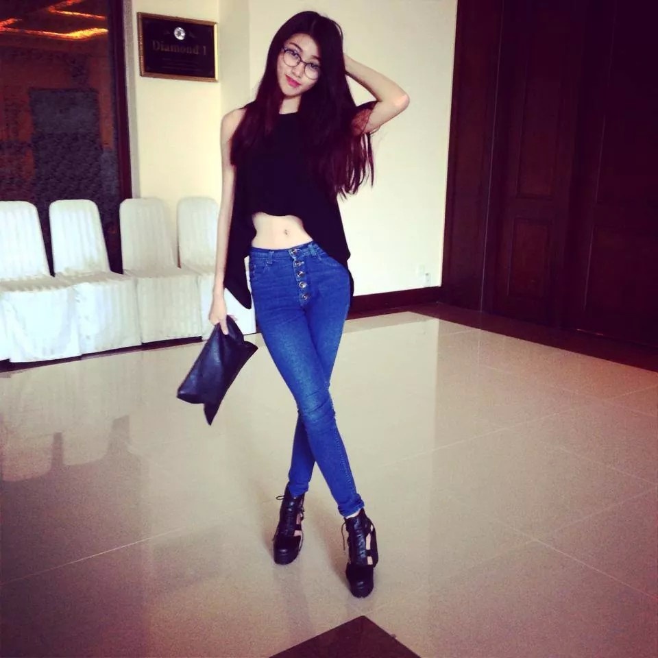 | Người mẫu trẻ Bill Quỳnh phá cách khi kết hợp áo crop-top nữ tính với quần jeans cạp cao. |