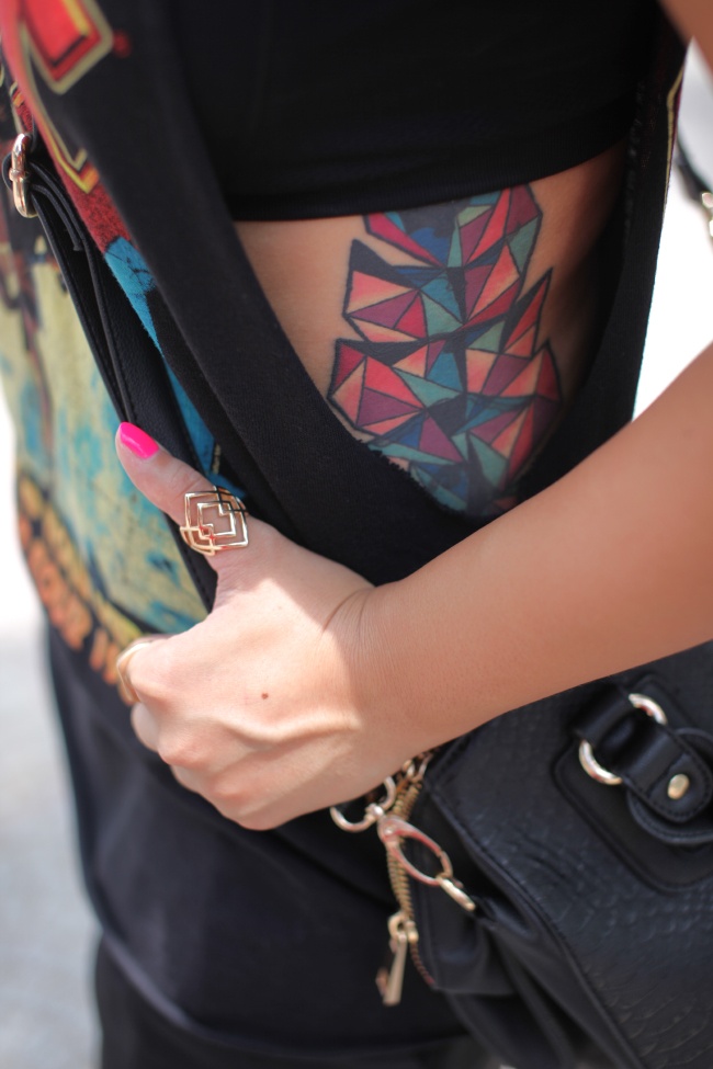 | Người đẹp còn diện áo khoét hông khoe hình xăm sắc màu, thể hiện cá tính mạnh mẽ. |