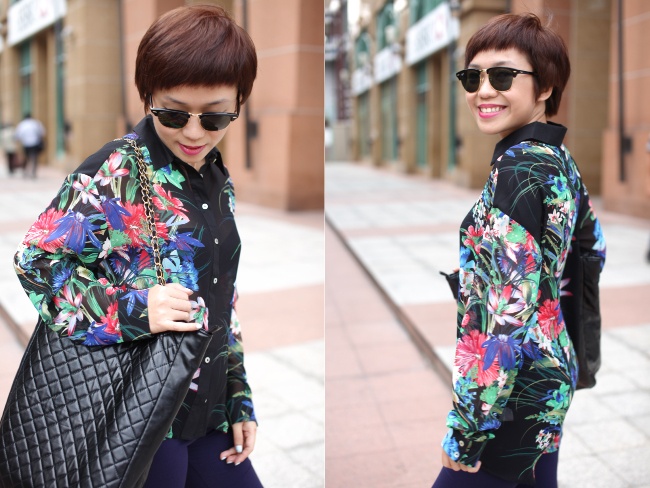 Mốt trang phục họa tiết hoa mùa hè cũng được một icon diện khá sáng tạo với cách mix cùng quần jeans và túi xách chần bông khổ lớn.