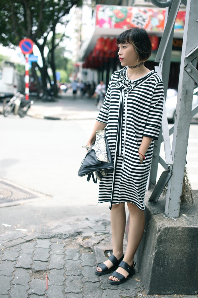 | Mốt sọc kẻ được một số icon cá tính diện khi xuống phố ngày cuối tuần. Trong ảnh, một icon thời trang diện váy dáng suông, mix ăn ý với giày sandals hiện đại, năng động. |