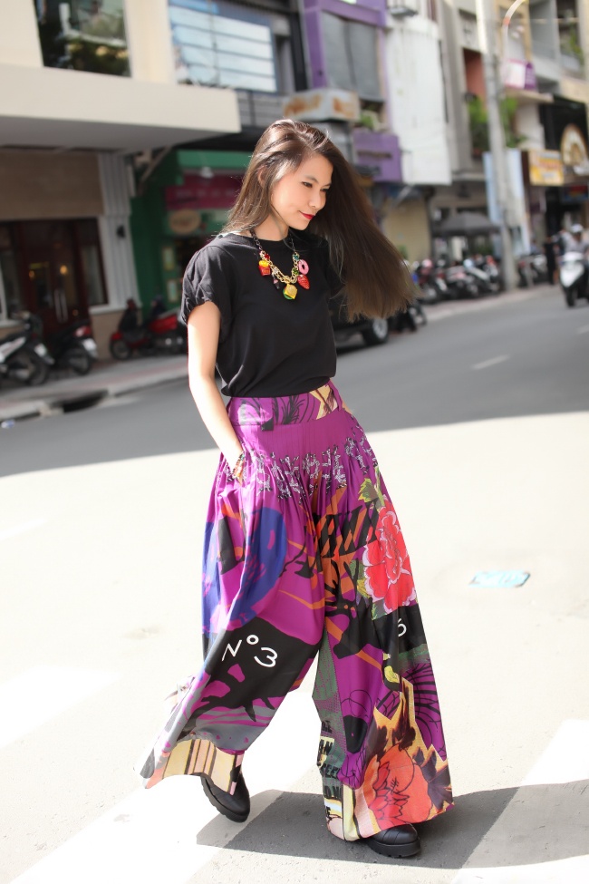 | Quần ống rộng in họa tiết nhiệt đới giúp một icon thời trang thu hút sự chú ý khi đi dạo trên những con phố trung tâm quận 1. Người đẹp trong ảnh còn mix khéo léo cùng áo và phụ kiện tối màu làm nổi bật hình ảnh hiện đại, hợp trào lưu. |