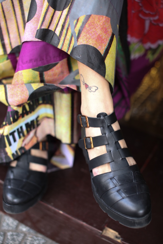 | Cận cảnh đôi sandal cá tính và hình xăm nhỏ cá tính trên mắt cá chân. |