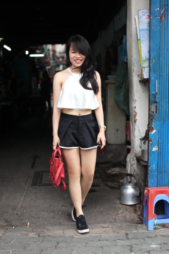 | Nhà thiết kế Nguyên Sa trông nữ tính khi thả bộ trên một con phố. Cô diện áo crop diềm bèo nữ tính, quần tối màu viền trắng năng động, giày bata phù hợp với phong cách phóng khoáng. |