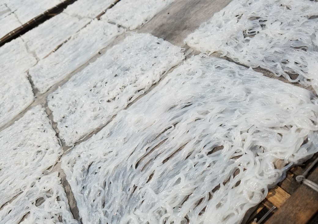 Bún song thằn là đặc sản bún khô nổi tiếng ở vùng đất An Thái bên dòng sông Côn, thuộc thị xã An Nhơn, tỉnh Bình Định. Nguyên liệu chính để làm bún song thằn là đậu xanh, xay thành bột, rồi lấy bột ép qua ống đục lỗ tạo thành sợi bún, thả vào nước sôi. Bún sau đó được vớt ra, xếp thành từng miếng hình vuông, phơi trên vỉ. Nhiều người cho rằng bún có tên "song thằn" là do kỹ thuật bắt bún thành từng đôi một. Ảnh: Nhanthuyfood. |