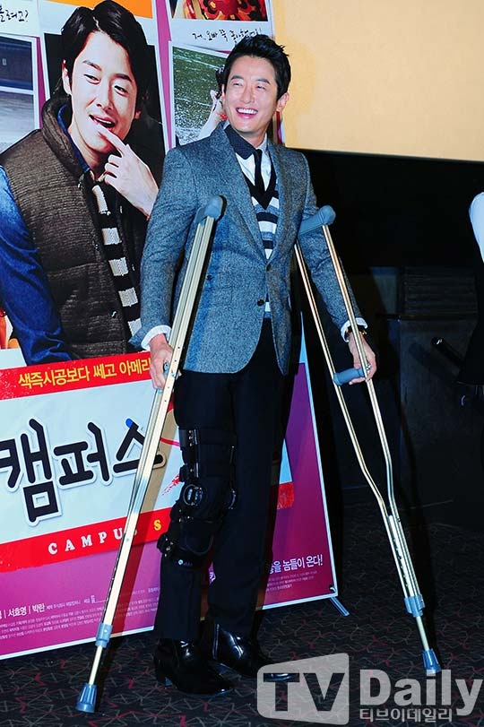 | Choi Phillip bị đứt dây chằng đầu gối nhưng vẫn tới họp báo bằng nạng. |