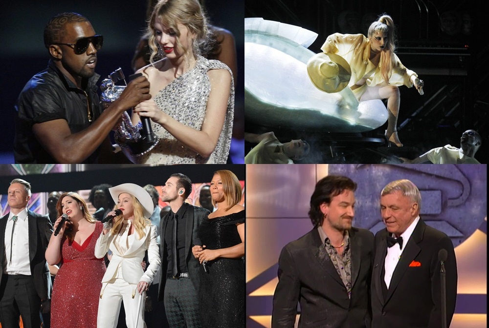 Đầu tiên phải kể đến Kanye West – người vốn được coi là “drama king” của showbiz Mỹ. Chắc không ai quên được lễ trao giải VMA năm 2009 khi Taylor Swift đang nói lời cảm ơn về giải thưởng Video xuất sắc của nghệ sĩ nữ, Kayne đã lao lên sân khấu cướp cúp. Tại Grammy 2015, rapper da màu cũng khiến khán giả một phen thót tim khi giả vờ “tái diễn” trong lúc Beck đang nhận giải Album của năm. Tuy nhiên, sau khi bất ngờ lên sân khấu Kanye lại không nói gì rồi trở về chỗ ngồi.
