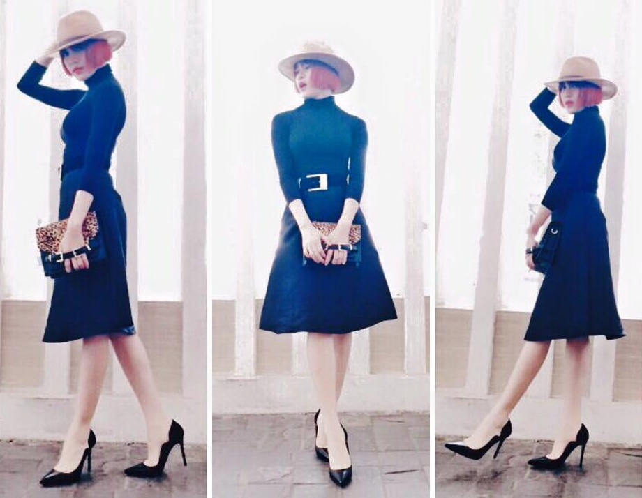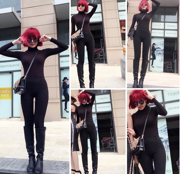 Em gái ca sĩ Thiều Bảo Trang cho thấy khả năng mix màu thành thạo. Trong ảnh, cô diện "cây đen" bó sát gợi đường cong cơ thể quyến rũ. Phụ kiện túi và giày thống nhất gam màu.