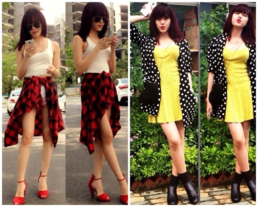 Xuống phố những ngày hè, người đẹp 21 tuổi chọn trang phục khỏe khoắn với áo tantop, quần shorts, sơ-mi caro. Đầm liền, áo cardigan chấm bi theo trào lưu thập niên trước rất phù hợp với dáng vẻ đáng yêu, nữ tính của Bảo Trâm.