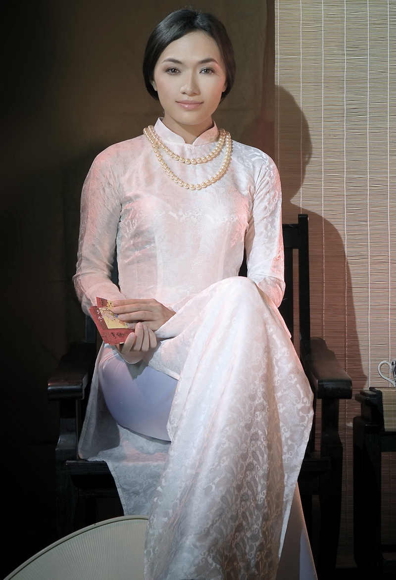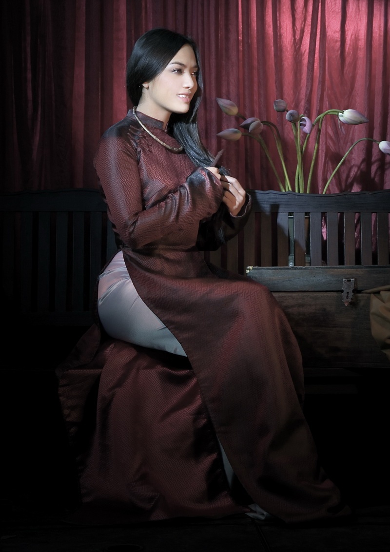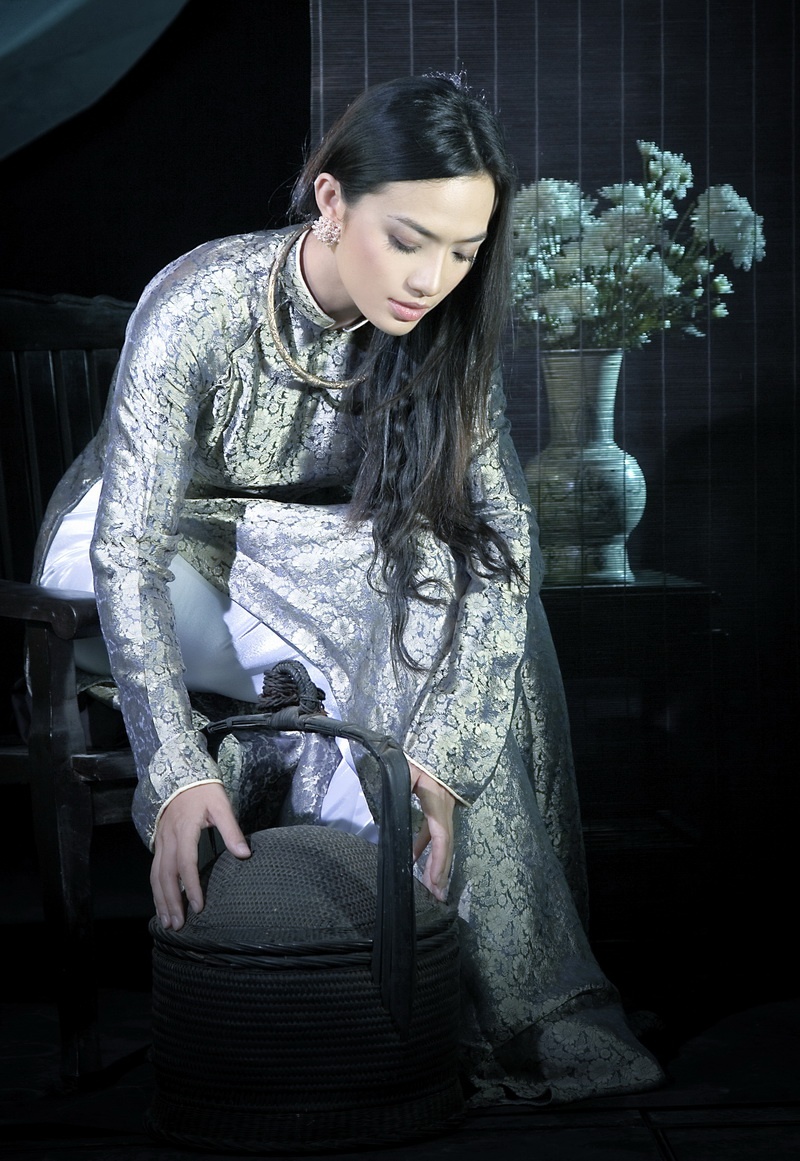 Không chọn cho mình những tà áo dài với màu sắc tươi vui, trẻ trung, Tinna Tình lựa chọn tà áo dài truyền thống và hóa thân thành cô thiếu nữ xưa.