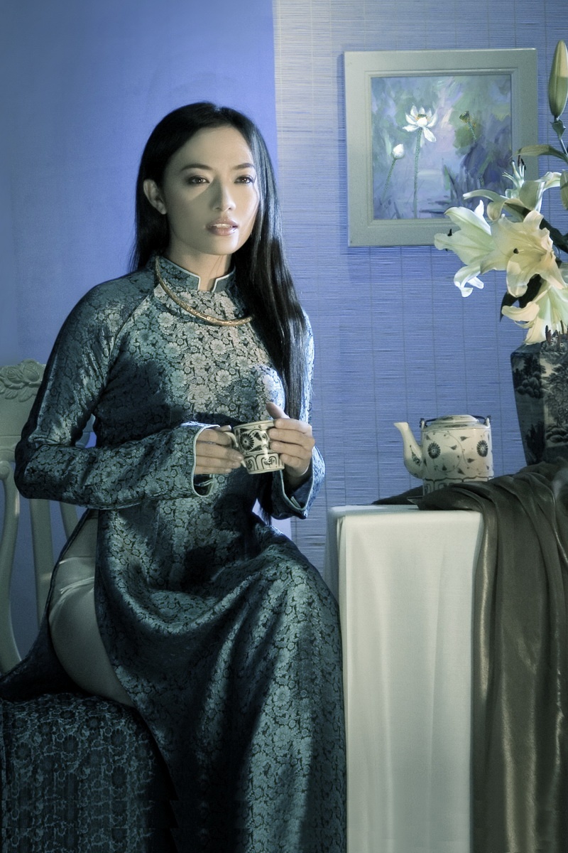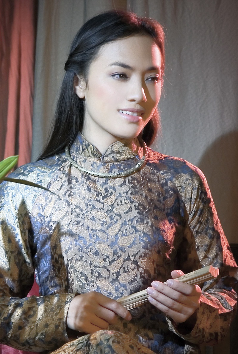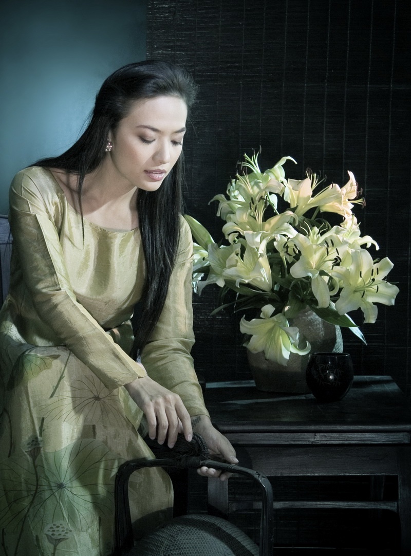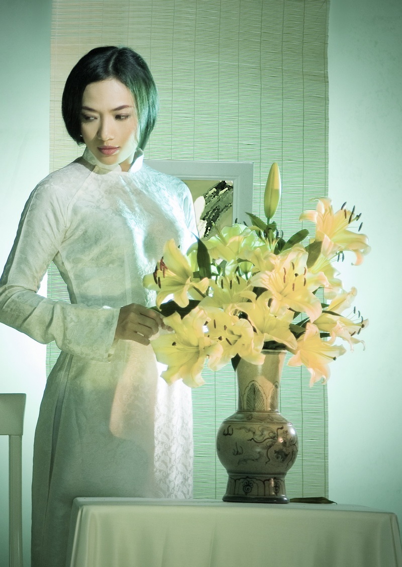 Không chọn cho mình những tà áo dài với màu sắc tươi vui, trẻ trung, Tinna Tình lựa chọn tà áo dài truyền thống và hóa thân thành cô thiếu nữ xưa.