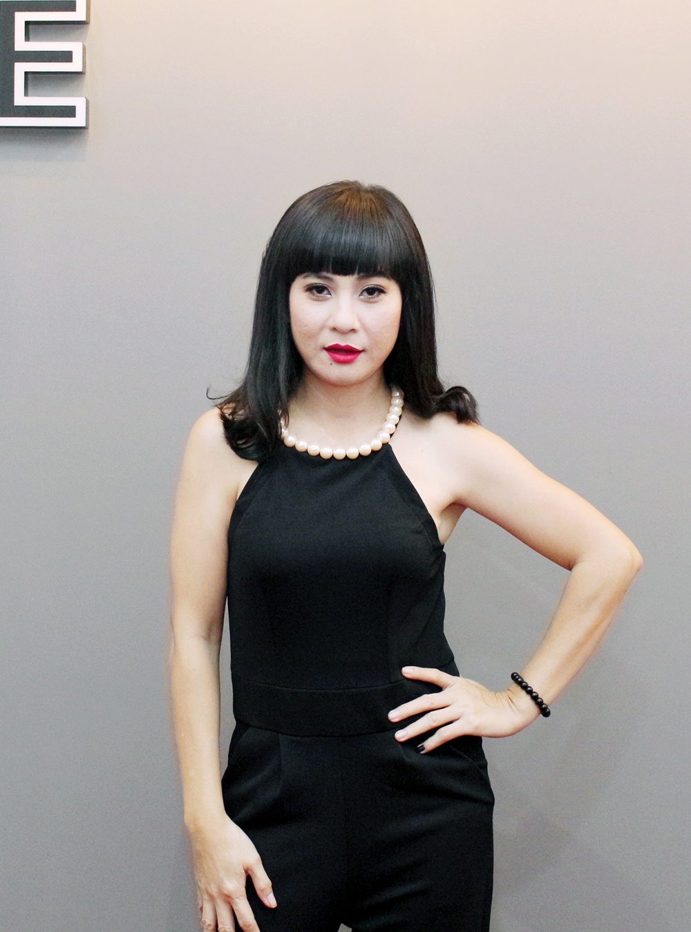 | Diễn viên Cát Phượng trẻ trung với tóc mái ngang và bộ jumsuit đen. |