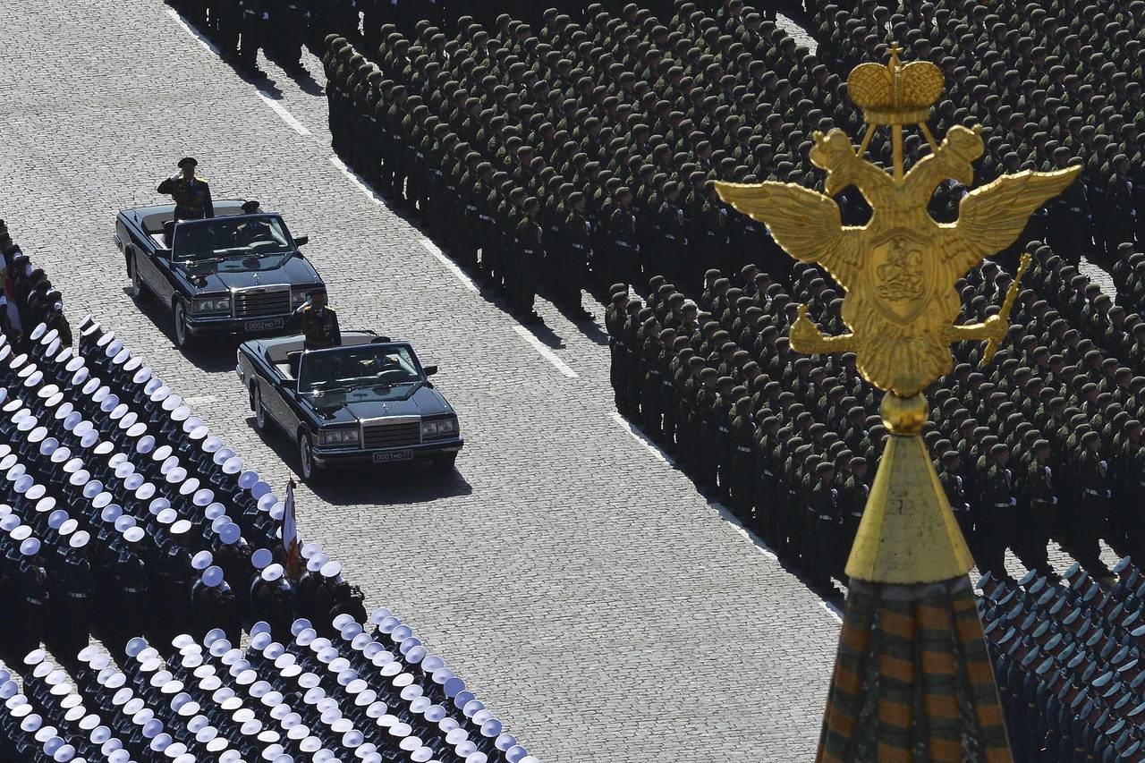 Xe của Bộ trưởng Quốc phòng Sergei Shoigu và Đại tá Oleg Salyukov duyệt đội danh dự. Ảnh: RIA Novosti