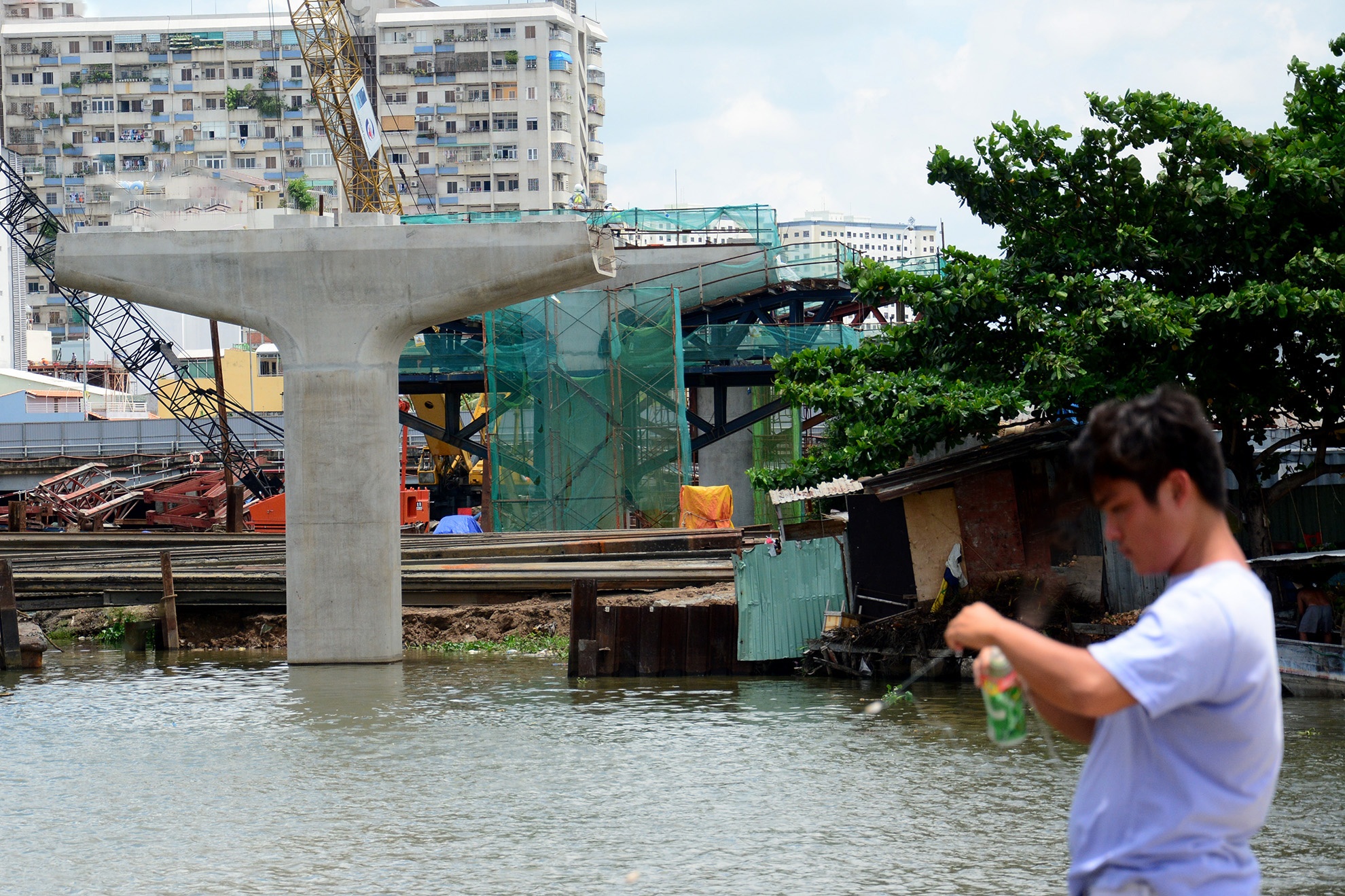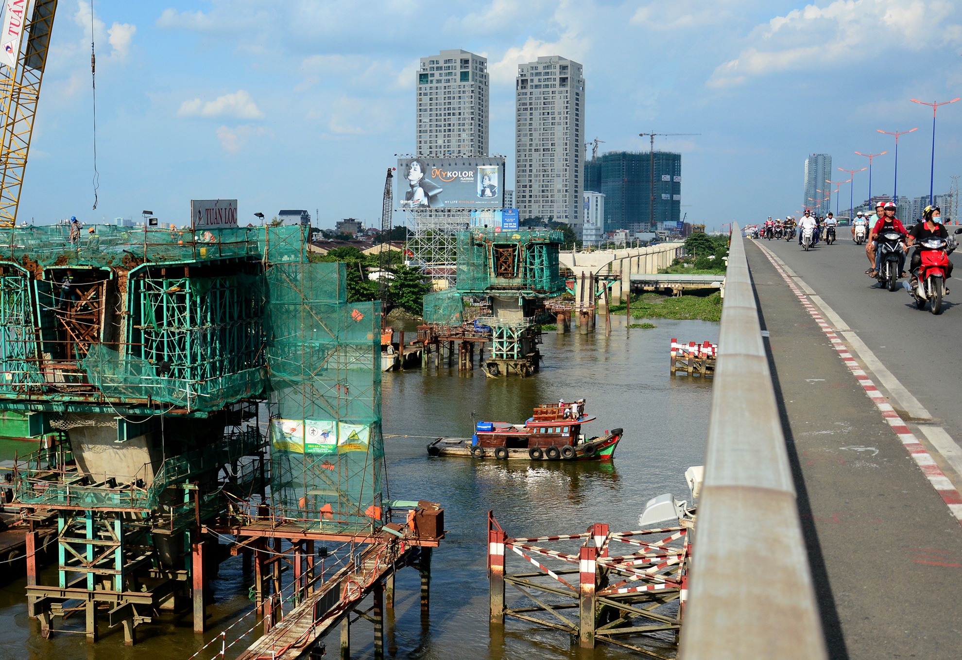 | Đoạn vượt sông Sài Gòn đang được thi công khẩn trương với chiều rộng 11 m, 2 trụ chính đã thành hình. |