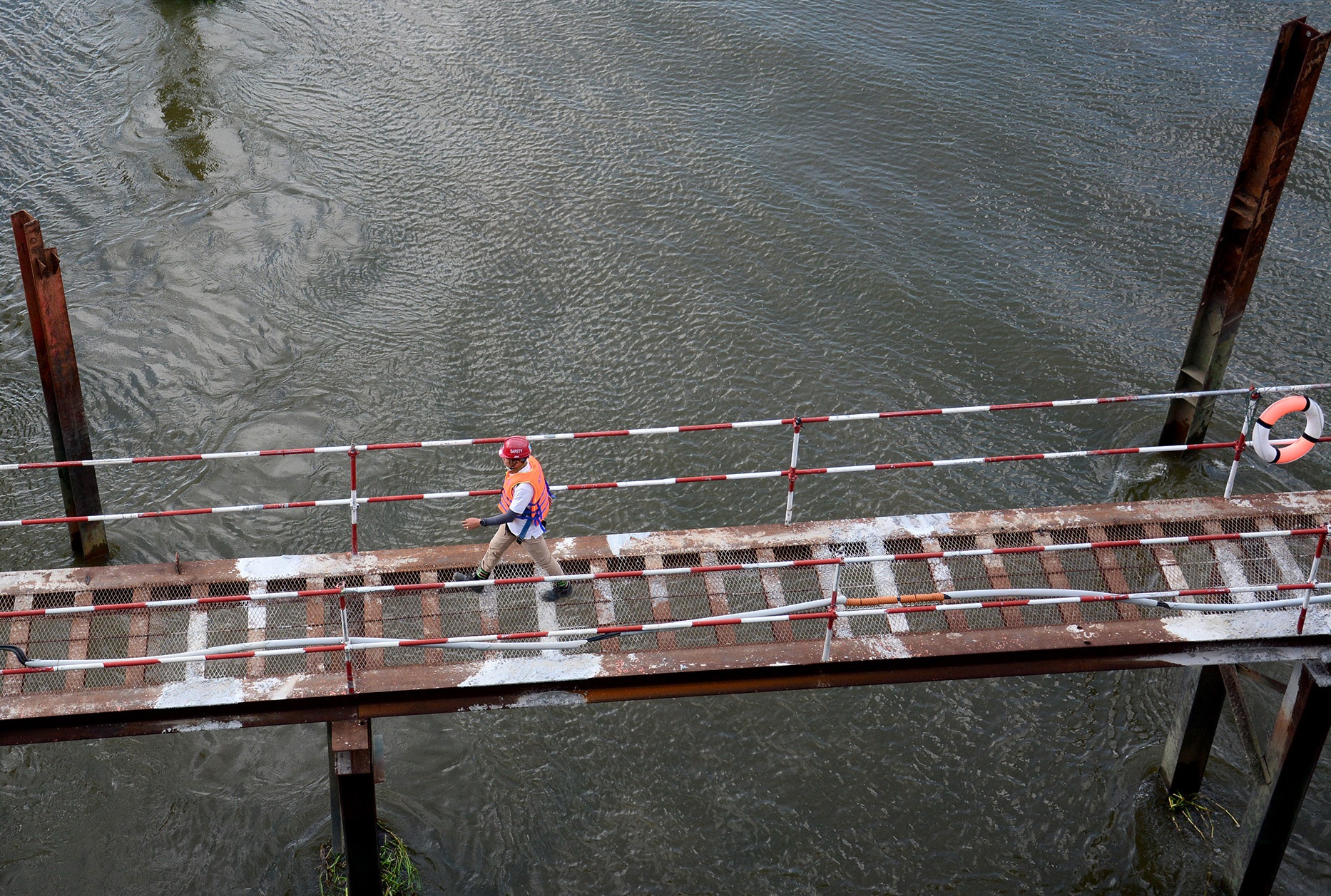 | Để tới được các trụ giữa sông, đơn vị thi công phải đóng cọc, bắc cầu tạm ở hai bên. |