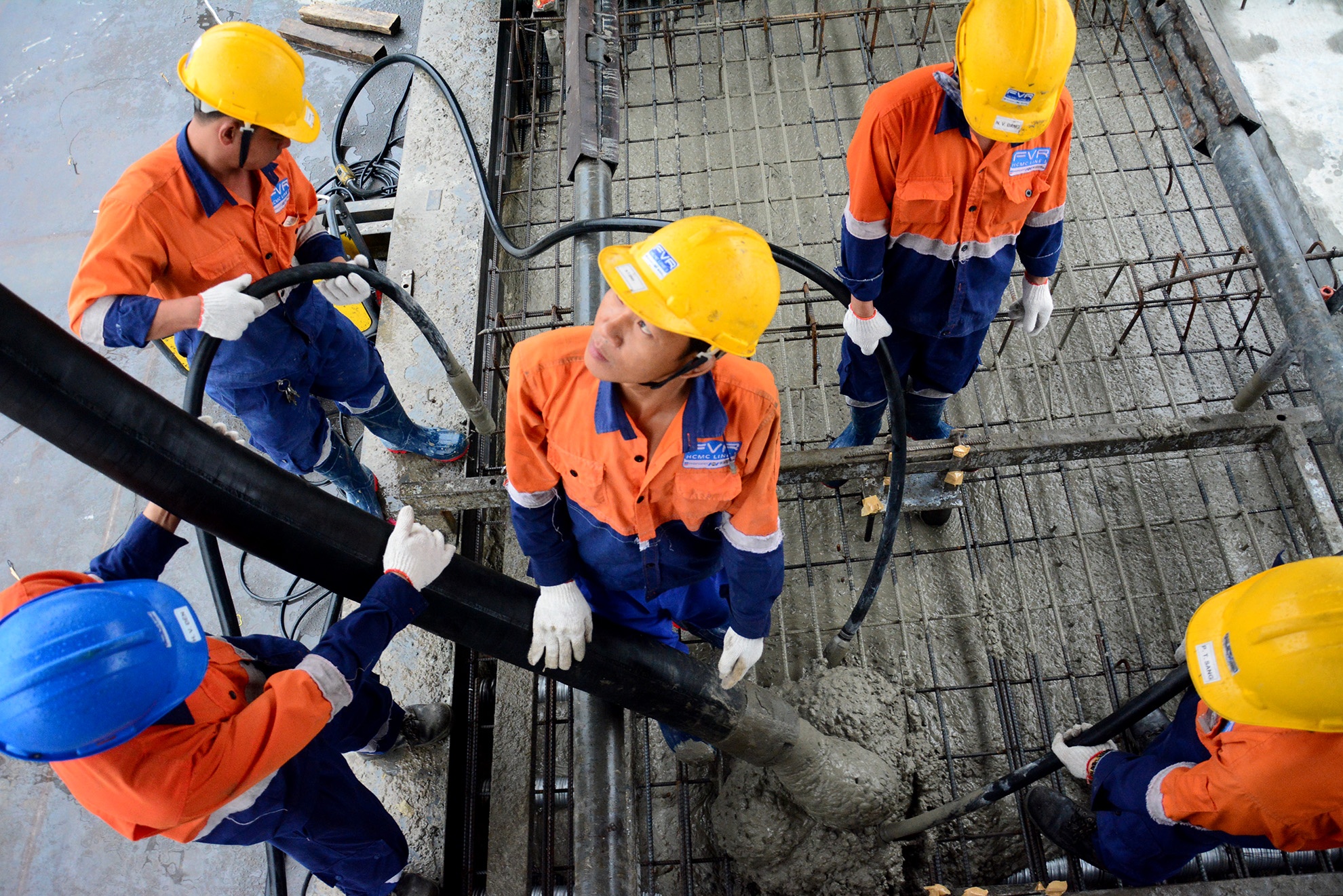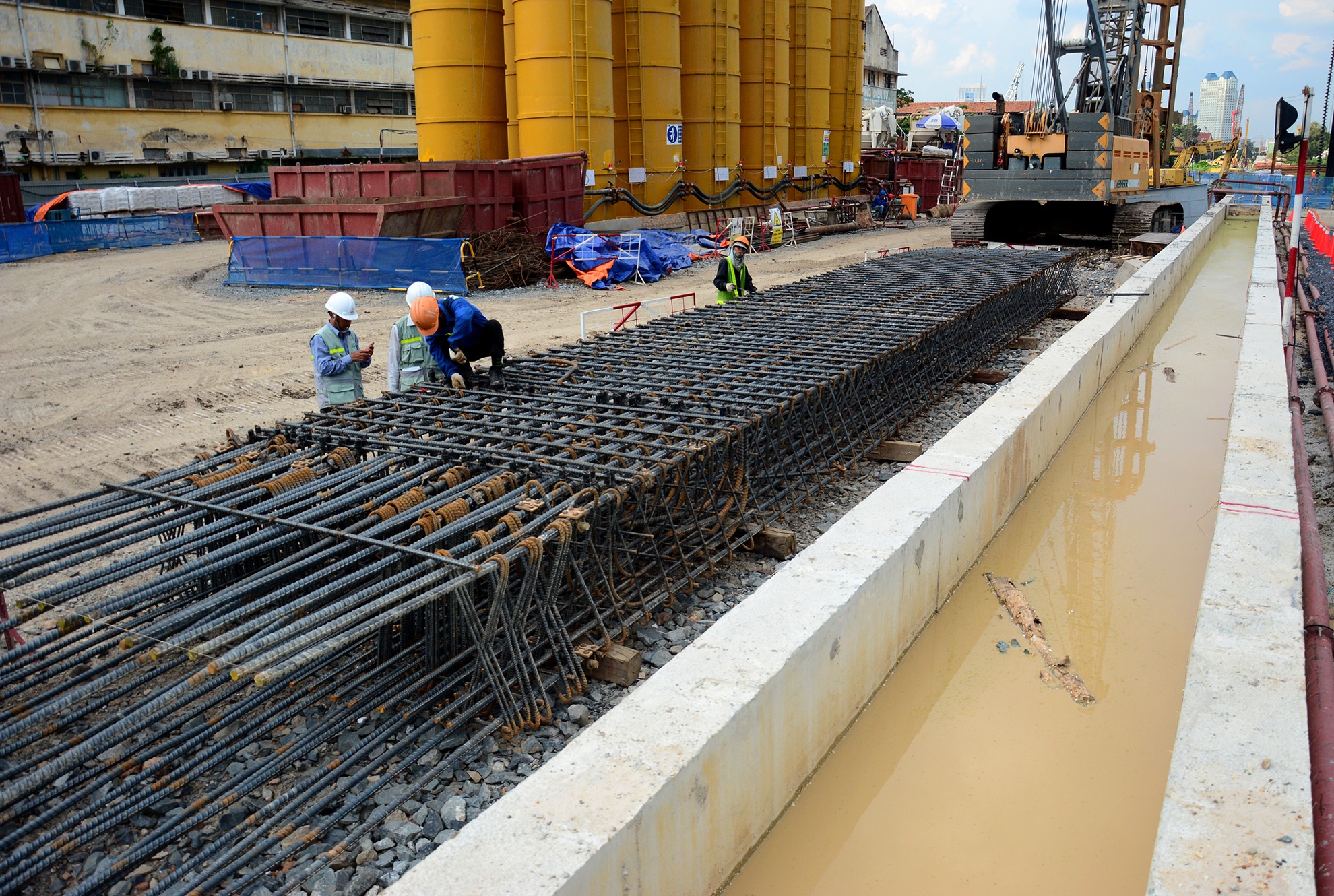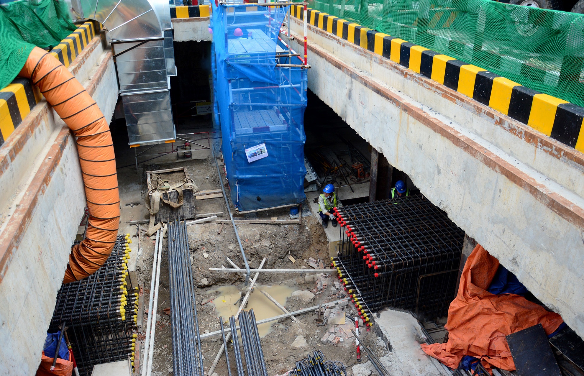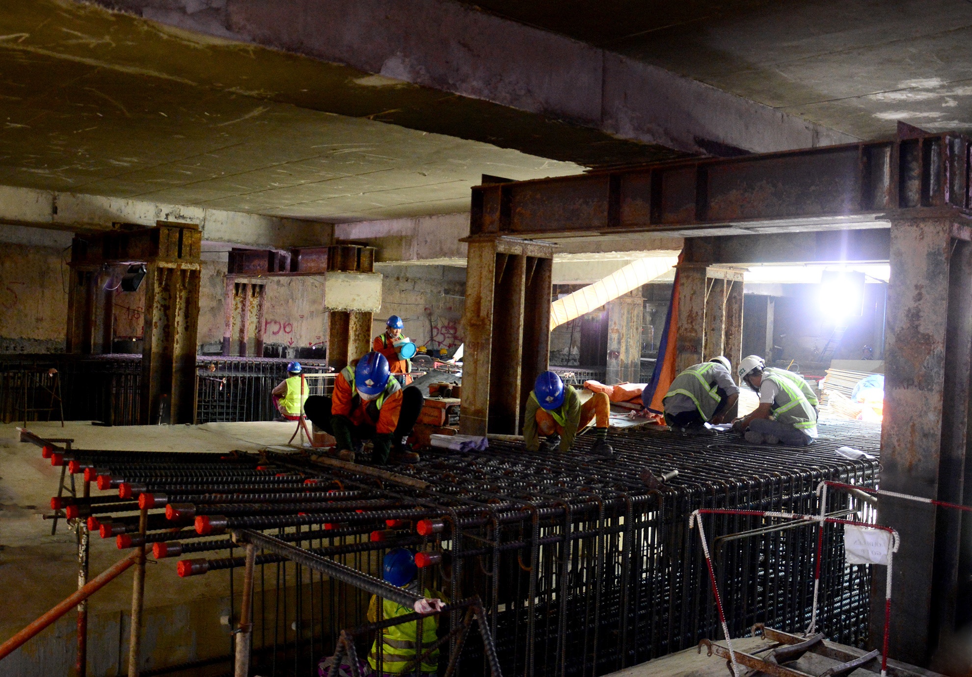 Dưới độ sâu khoảng 4 m ở ga Nhà hát Thành phố và chợ Bến Thành, từng tốp công nhân, kỹ sư đảm nhận những công việc khác nhau, trong đó đã hoàn tất tường vây, cọc chống chủ, đổ bê tông một nửa sàn tạm.