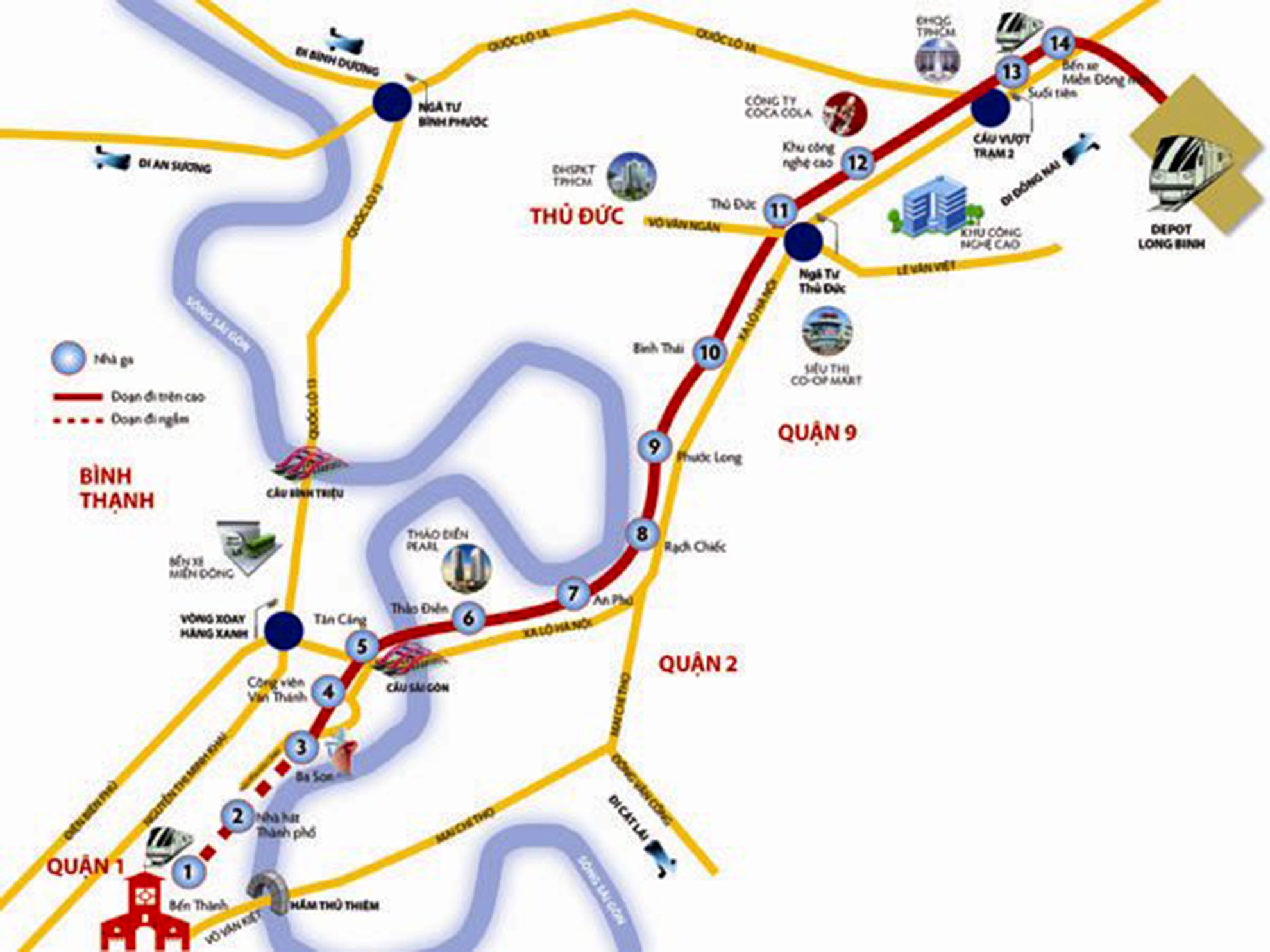 Dự án Metro Bến Thành - Suối Tiên (tuyến số 1) có tổng vốn 2,49 tỷ USD, khởi công vào tháng 8/2012. Tuyến tàu điện này dài gần 20 km, đi qua các quận 1, 2, 9, Bình Thạnh, Thủ Đức (TP HCM) và huyện Dĩ An (Bình Dương), trong đó, khoảng 2,6 km đi ngầm (3 nhà ga) và hơn 17 km trên cao (11 nhà ga).