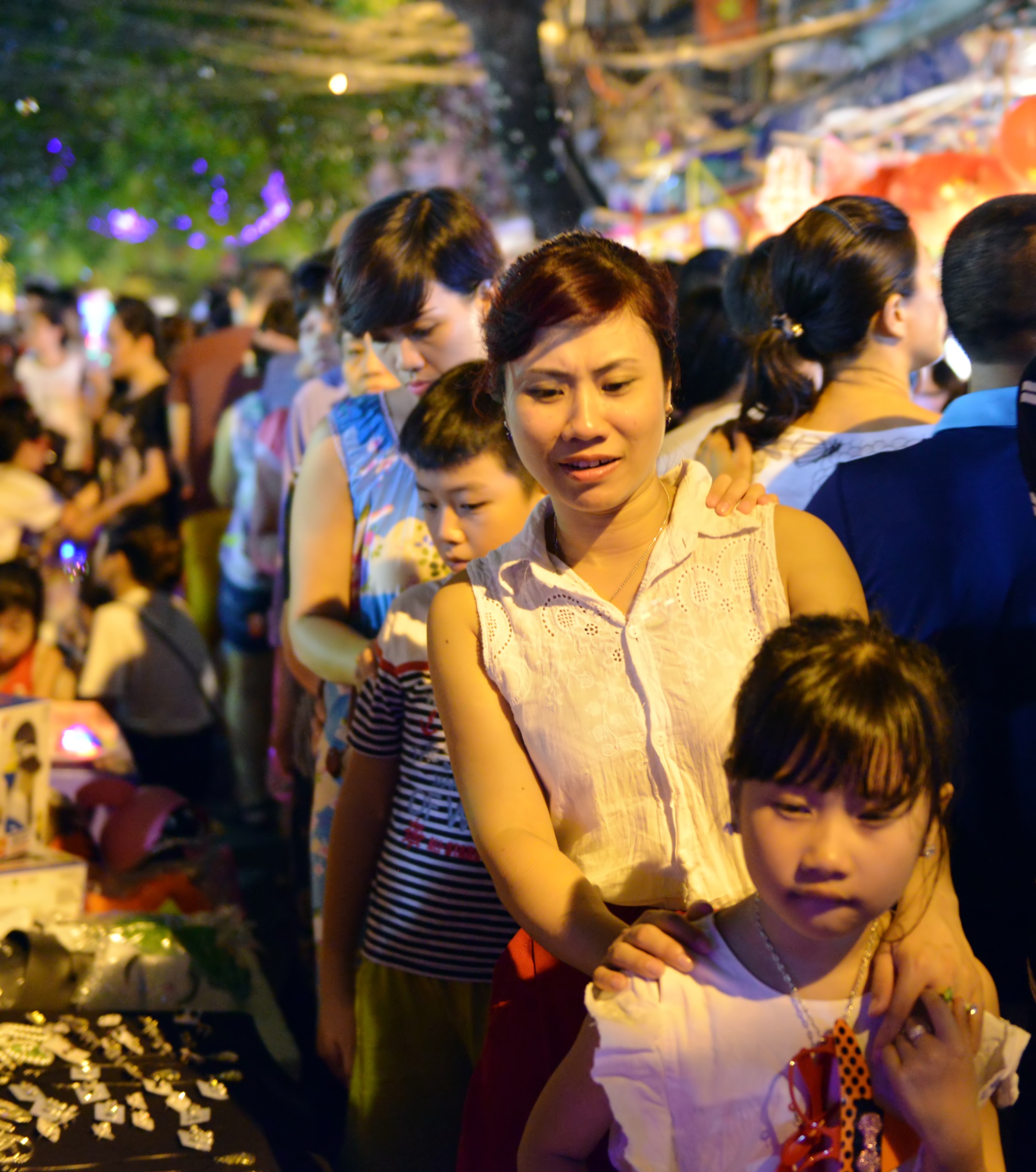 Anh Tiến công kênh con trai lên vai để vượt qua dòng người đông đúc. Anh cho tâm sự: "Dù biết đông nhưng cả năm có một dịp trung thu dành cho trẻ con. Sau lần này chắc tôi không dám đến đây nữa, chen chúc khổ quá".