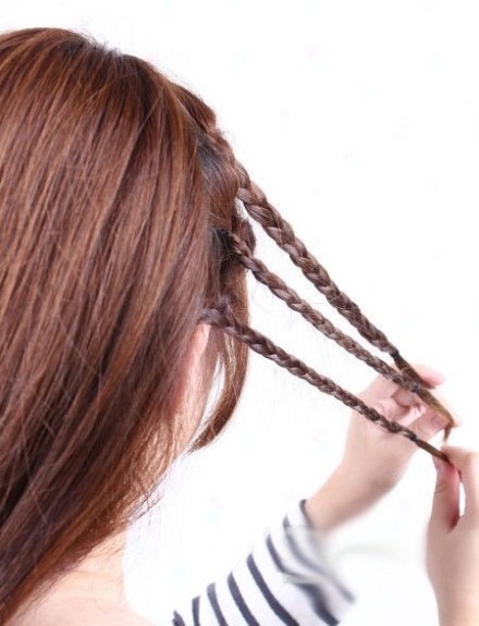 | Chia mỗi bên tóc thành 3 lọn nhỏ bằng nhau. Tết các lọn tóc thành 3 bím tóc nhỏ |