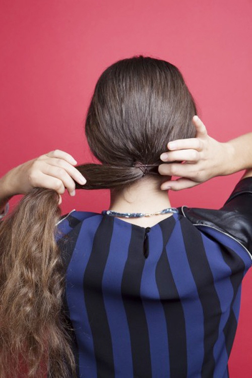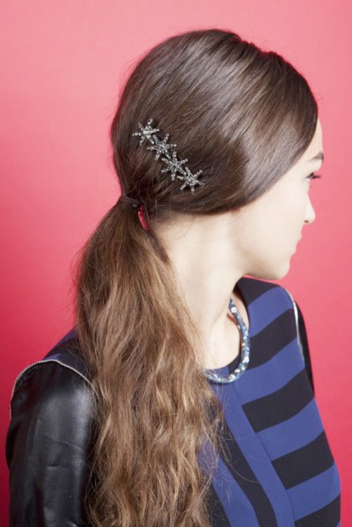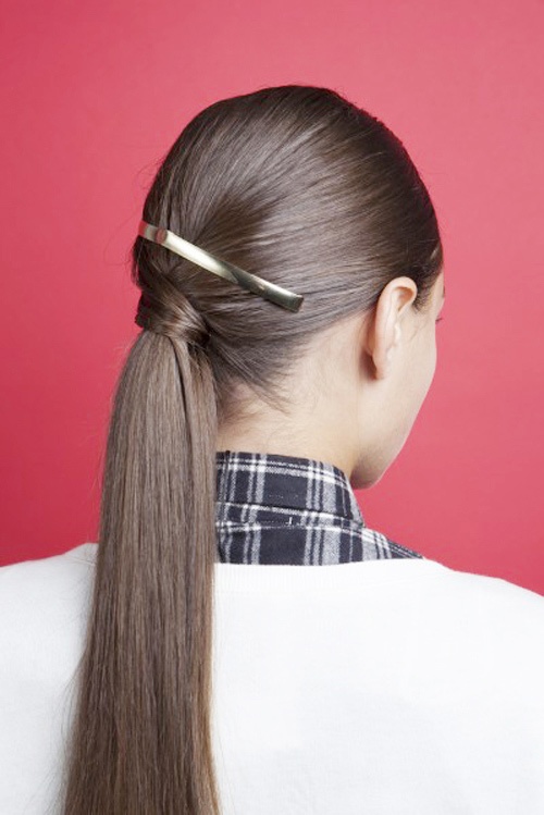 | Sau khi cột tóc, dùng tay và lược chỉnh lại để tăng độ phồng cho phần chân tóc. Cuối cùng sử dụng một chiếc kẹp lệch giúp tăng vẻ ấn tượng cho mái tóc. |