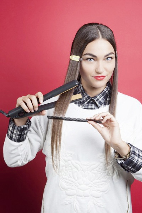 | Trước tiên bạn dùng máy ép để là thẳng tóc. Bước này có thể bỏ qua nếu bạn có mái tóc thẳng. |