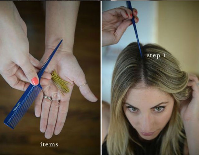 | Đầu tiên, bạn cần chuẩn bị một chiếc lược nhỏ, cặp ghim và dây chun nhỏ. Bước 1: dùng lược chia lại ngôi giữa cẩn thận. |