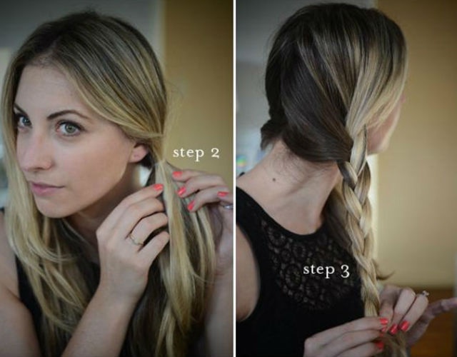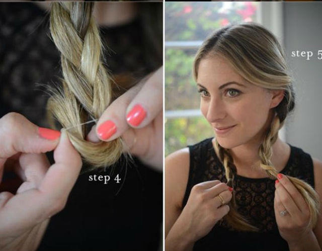 | Chia toàn bộ tóc thành hai phần, dùng dây chun cố định phần tóc bên táy trái lại và "xử lý" phần tóc bên phải. Chải lại một lần để tóc suôn mượt rồi tết ba như bình thường. |
