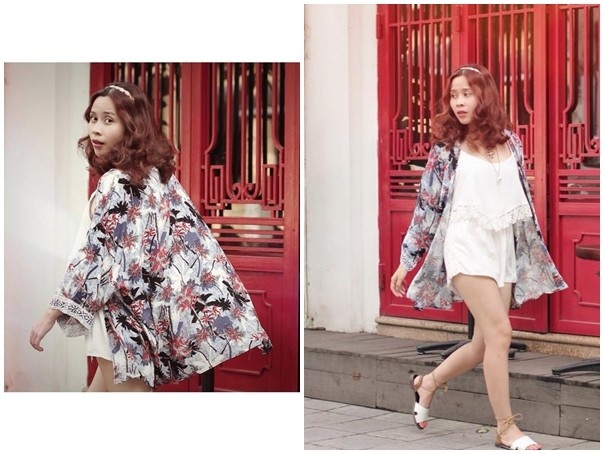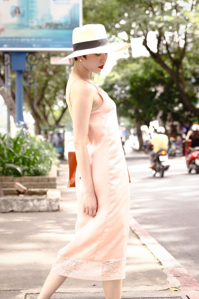 Sau khi ghi điểm với loạt trang phục cổ điển, nữ tính ở những ngày đầu vừa về Việt Nam, chiều 28/7, nữ ca sĩ tự tin xuống phố với mốt váy ngủ cá tính và phóng khoáng. Mốt mặc nhà có chất liệu lụa tự nhiên mềm mại, tông màu hồng nhã nhặn hợp vóc dáng. Phụ kiện mũ rộng vành ăn nhập với mái tóc tém cá tính và gương mặt trái xoan.