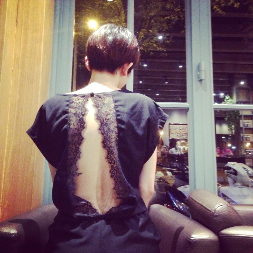 Thiết kế có điểm nhấn là khoảng hở thông thoáng phía lưng áo, để lộ hình xăm là hàng chữ tiếng Anh.