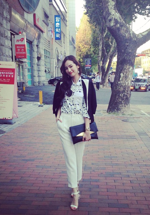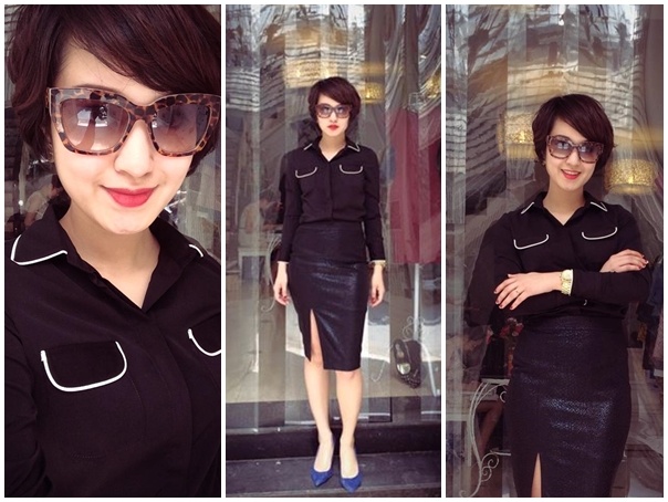 | Bà mẹ một con Mi Vân trung thành với gu cổ điển, nền nã. Bộ cánh tối màu mix tinh tế giữa chân váy bút chì và áo sơ-mi nhấn nhá viền trắng giúp cựu hot girl nổi bật khi dạo phố. |