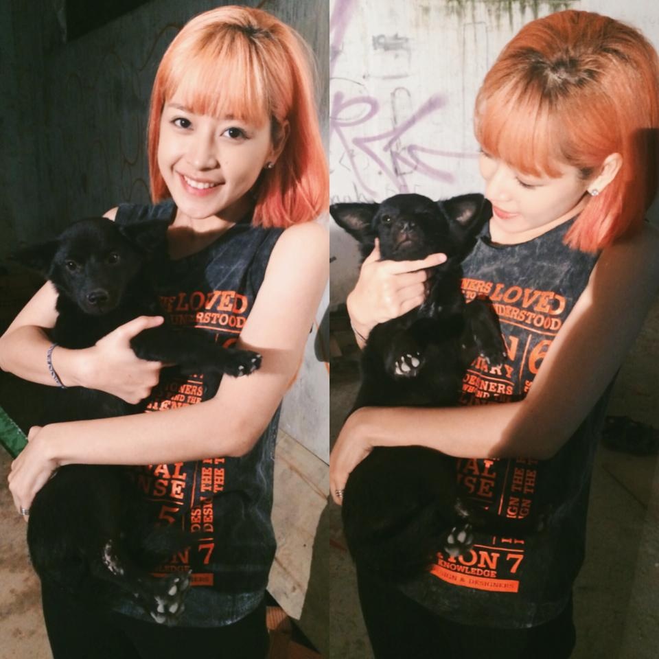 | Hot girl Chi Pu diện mốt áo thun cam đen hợp tông cùng màu tóc cá tính. |