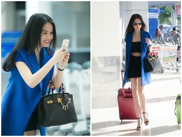 | Đáp chuyến bay ra Hà Nội dự sự kiện cuối tuần, Ngọc Trinh nổi bật với phong cách mùa thu sành điệu. Áo vest màu xanh da trời mix tinh tế cùng áo crop-top khoe eo thon và chân váy ôm lộ chân dài. Phụ kiện túi xách Hermes trị giá hơn 400 triệu đồng làm điểm nhấn. |